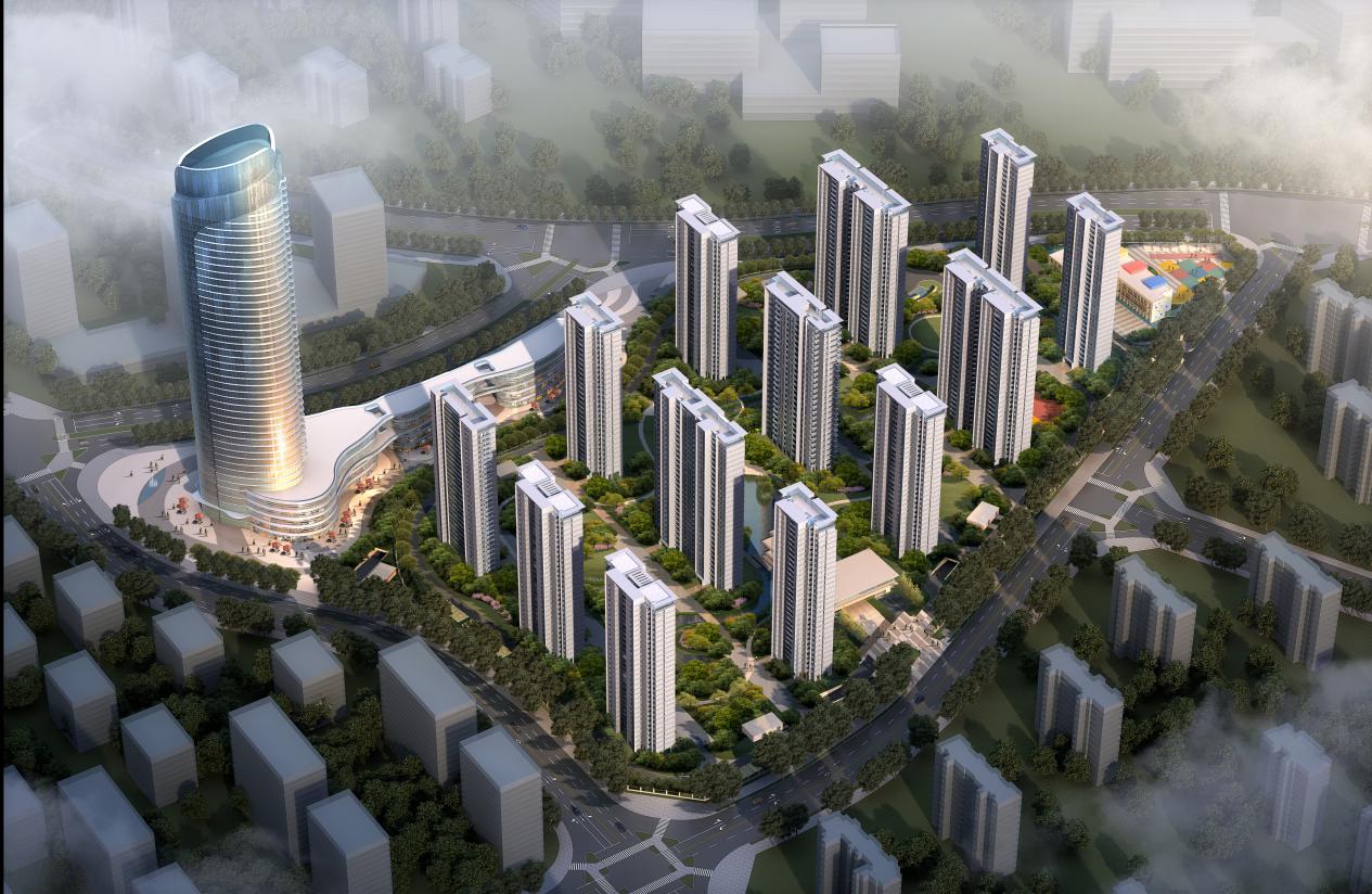 項(xiàng)目占地面積約209畝,總建筑面積約40萬(wàn)方,容積率約2.8,綠化率達(dá)30%。本項(xiàng)目建筑設(shè)計(jì)遵循“以山水之蘊(yùn),天地之氣充盈其間,盡顯人文內(nèi)涵”的原則,整個(gè)項(xiàng)目由13棟住宅樓和1棟199米超高層寫字樓(金融中心)和2棟智創(chuàng)中心,1棟鄰里中心,1個(gè)9班雙語(yǔ)幼兒園組成。